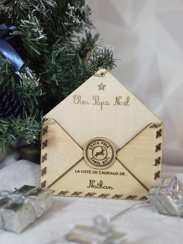 Cette jolie enveloppe décorative à accrocher dans le sapin, gravée au prénom de votre enfant est le trésor qui gardera précieusement la liste de cadeaux.